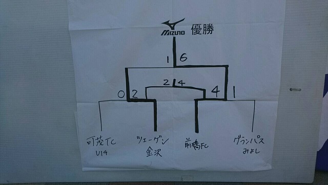 レイソルTORvsグランパスみよし 青森山田vsツエーゲン ツエーゲンvs可茂TC(U14) 決勝戦(前橋FCvsツエーゲン) 大会試合球 3月28日の決勝トーナメント会場のみミズノスパイクの試し履き そして結果発表 決勝トーナメント 2位トーナメントA組 2位トーナメントB組 第3位 グランパスみよし 準優勝 ツエーゲン金沢 優勝 前橋FC!! MVPは、山内くん!! 2日間とてもいい天気の中、大会ができたこと良かったです。 また、U13で過ごした1年間の成果をどのチームも確認できたのではないでしょうか? そしてU14→U15と順調に成長していってほしいものです。 最後に、たくさんの皆さまのご協力のお陰で無事大会を終えることができ、本当にありがとうございました。 来年もできるといいですが、ミズノさん次第です。 PR コメントを投稿する